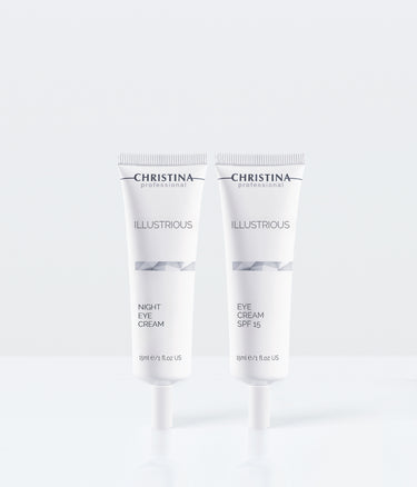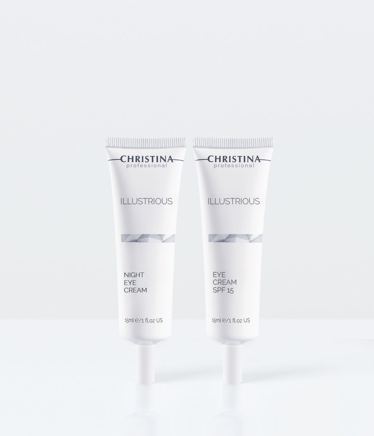 שגרה יומית ממוקדת לאזור העיניים הכוללת קרם יום עם SPF וקרם לילה מסדרת Illustrious. נועדה לשפר את נראות הכהויות והנפיחות, לאחד את הגוון סביב העיניים ולהעניק תחושת מיצוק, לחות ורעננות.