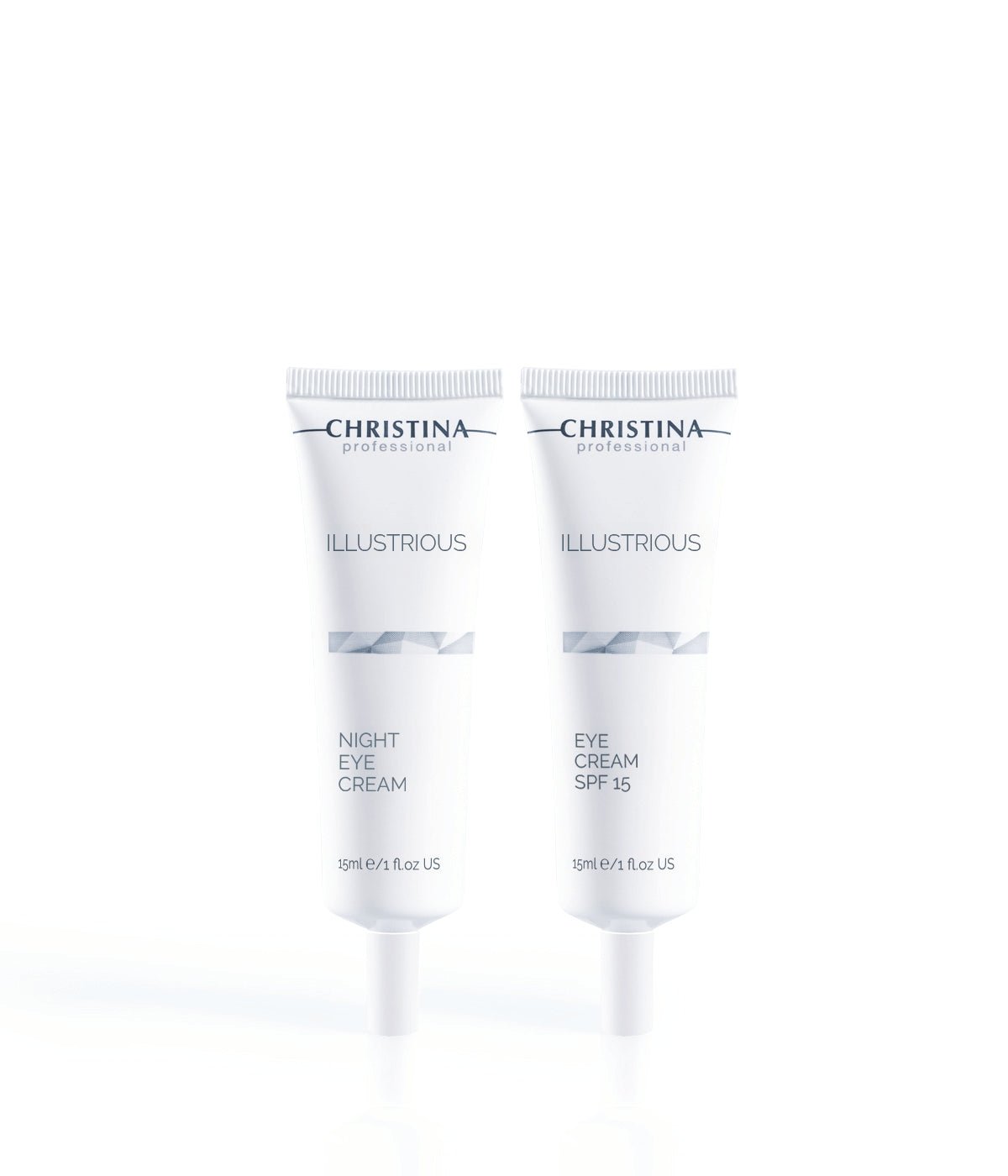 שגרה יומית ממוקדת לאזור העיניים הכוללת קרם יום עם SPF וקרם לילה מסדרת Illustrious. נועדה לשפר את נראות הכהויות והנפיחות, לאחד את הגוון סביב העיניים ולהעניק תחושת מיצוק, לחות ורעננות.